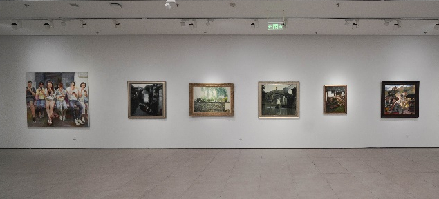 “致敬逸飛”畫展現場,中間四幅為陳逸飛作品