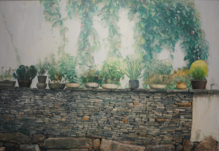 陳逸飛此次有四幅水鄉作品展出,分別為創作于1983年的《清晨》《后花園》《悠悠小船》,以及創作于1984年的《寧靜的傍晚》?!逗蠡▓@》看似簡單,描繪的是古鎮民宅的一堵磚墻和一排盆栽綠植,卻是陳逸飛耗時最久、耗費心力最多的一幅。這不僅僅是指油畫的技法,也恰恰說明了陳逸飛的樸素初心——一草一木、一磚一瓦,皆有靈性。