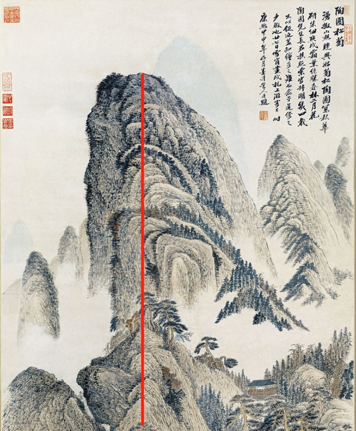 吳歷獨創的“陽面皴”,表現出陰陽向背的關系,如圖沿紅線分割