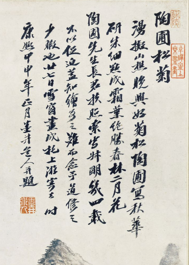 文中提到的陶圃先生就是陸培遠,他喜歡種植菊花、松柏,他的莊園在嘉定南翔,名叫“陶圃”,而其長子正是“扶照”,就是清代著名茶學家,著有清代第一茶書《續茶經》的“茶仙”陸廷燦。陸廷燦向吳歷定制這幅王蒙筆法的畫,結果讓他等了將近四年。吳歷畫完后,托弟子陸道淮寄去。