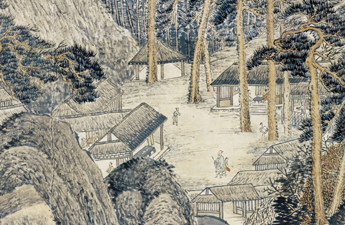 畫幅中段,隱居者生動逼真,甚至可以看見仙鶴立于其間