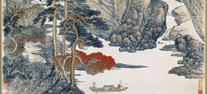 在這幅畫中,吳歷用類似于釘頭和雨點般的短皴來表現坡石,層層積墨,再用焦墨點苔,顯得老辣凝重、沉郁蒼樸。喬松和夾葉樹掩映在岸邊,一位紅衣高士正在船上垂釣,此處用色清麗明潤,人物刻畫細膩,有王蒙《秋山草堂圖》的影子。