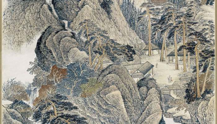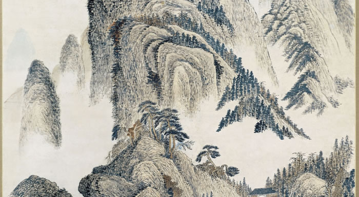 這繁茂蒼古的山體,左右兩側,明顯是一陰一陽。吳歷用牛毛皴、解索皴,和他獨創的“陽面皴”,表現出陰陽向背的關系。有人說,這樣的畫法是受到了西洋畫的影響。