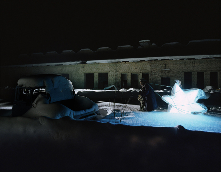 “月亮先生”列昂1953年出生于俄羅斯烏拉爾山脈腳下的一戶教師家庭,周邊居住的家庭雙手可數。童年的他長于童話夢境、神話蠻荒交織的場景里——冰天雪地覆蓋下的森林木屋、星辰、麋鹿、山谷……成為了他一生的創作源泉和作品底色。以月光作伴,其實是他“童年本體論”的當代轉譯:那些在冰原木屋凝望星空的夜晚,那些未被規訓的浪漫想象,在月亮私密的銀色軌跡中獲得重生。