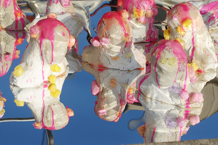 除了環境議題,祎婧對“身體”與“身份”的探索同樣深刻。2024年,在《Ac’me》中,祎婧將“青春期痘痘”視為一種視覺—社會的交匯點。作品以過期棉花糖模擬皮膚肌理,搭建出一個既柔軟又帶有生理隱喻的裝置系統。這種材料選擇本身即充滿指涉——它腐敗、易變形、具有可食性,但在此被賦予一種“身體不可控性”的再現功能。