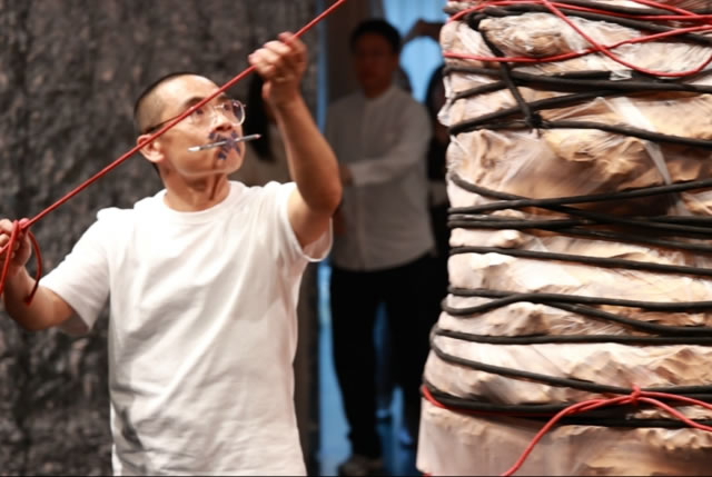 早在展覽開幕前幾天,藝術家袁恒便以一根泥柱和藍色圓形地毯構建起陰陽合一的氛圍,然后用紅黑色的繩子將碩大的根器牢牢捆扎住,形成對抗、掙扎、解放的場域感受。