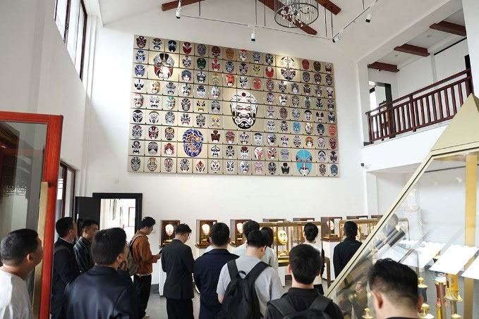 大廳左側,百余面不同深刻寓意的臉譜鋪滿墻面,中國傳統文化中的濃墨重彩,獨特的華夏文化符號,“心靈的畫面”,朱砂勾勒忠義赤膽,墨玉雕琢鐵面無私,金粉點染神性光輝,青綠渲染草莽豪情,花三塊瓦臉,十字門臉...,以色傳神,以形寫意,上演民族文化史詩。
