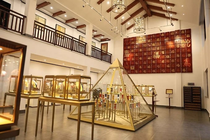 活動當天,五糧液濃香酒公司黨委書記、董事長劉華等一行領導先后參觀了各個文化展廳,萬茗堂總裁郭雅琴等人陪同,詳細介紹了各個展廳的設計理念、文化內涵等。大廳內部,龐大的華夏美學矩陣震撼著每一位來訪者的感官。36樽宜賓五糧液股份有限公司出品真龍天子至尊龍郵紀念酒如星辰列陣,寓意深邃的臉譜酒、福酒等卓然矗立其間,汲取千年文化底蘊,傳統文化符號與現代精神在此完美結合,磅礴的文化酒水陣容鑄成文化豐碑,巍峨的文明殿堂。