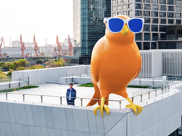 這件作品名為《CUI CUI》,它是一只橙色的金絲雀,它的名字“CUI CUI”來自法語中模仿小鳥鳴叫的擬聲詞,它代表著一種不凡的自我意識。藝術家希望“CUI CUI”能以它親切可愛的形象給人慰藉,與觀眾產生情感鏈接。它暢游于天地之間。此刻,它置身于一個自由廣闊宏偉的城市中,正充滿信心地凝望著無垠的遠方。