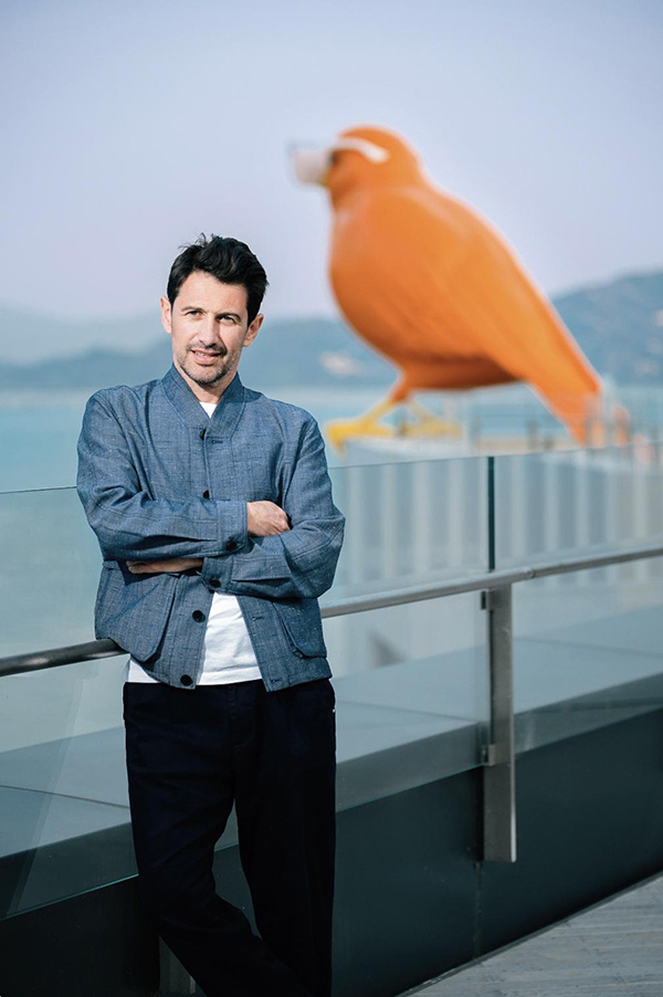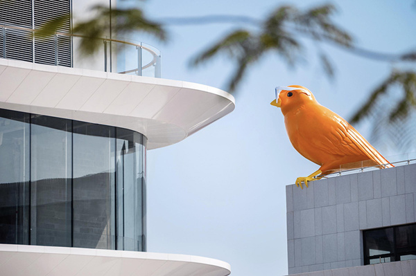 洛朗·佩爾博斯通常使用日常物品創作。他的靈感來源于我們熟悉環境中的普通物件,通過重新建立日常物之間的關系,形成新的語義表達,同時通過各種形狀和材質的對比,建立起觀眾與作品之間的互動關系和共鳴。這只停在樓頂上戴著墨鏡凝望遠方的金絲雀,對洛朗·佩爾博斯來說象征著自由,同時也代表著希望和新生。它是一個滿含樂觀、展望未來的探索者。如今它從遠方的山海奔赴而來————“Hello太子灣!”