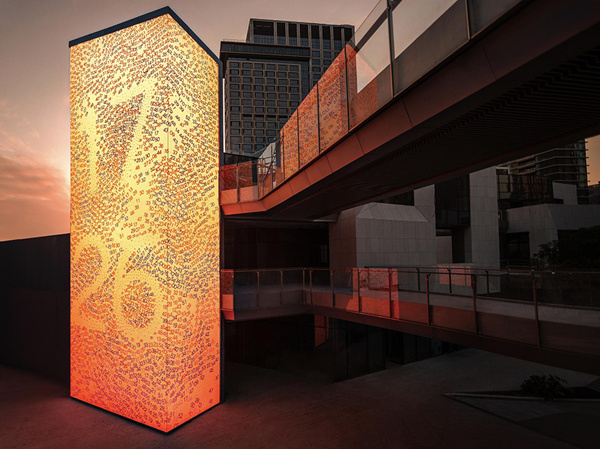 這件作品釋放了時間瞬息與永恒間變化的詩意,呼應著太子灣花園城的環境,每日分四個時間段,作品的視覺呈現根據真實的時間不斷流動變化。從清晨的薄明到正午的驕陽,從傍晚的夕陽到夜晚的熒光,這件作品試圖以一種融入的狀態加入到周圍的建筑和社區環境中,與建筑、天空和深圳的橘子海、熒光海形成和諧的共生關系,并以流動的光影為環境著色。