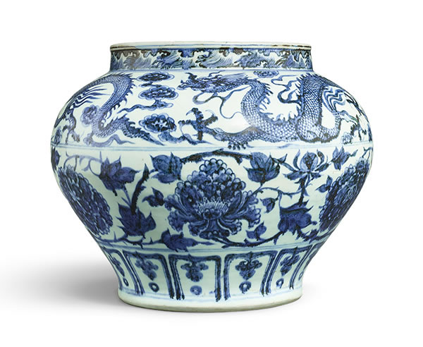 藝海觀濤:坂本五郎珍藏中國藝術 – 選粹(二) 元 青花纏枝牡丹云龍紋罐 直徑 34.9 公分;高 27 公分 估價:4,000,000 - 8,000,000 港元
