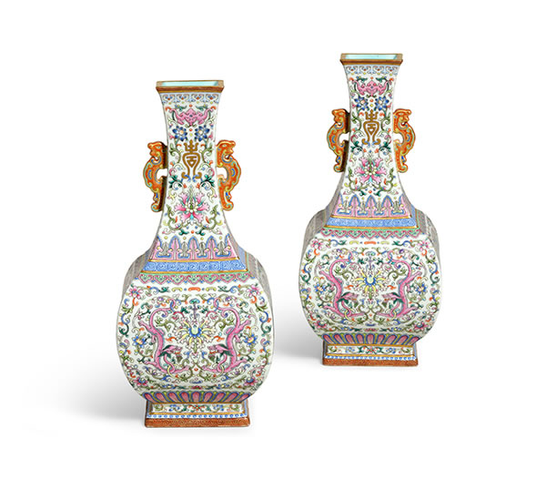 重要私人收藏 清乾隆 粉彩福壽連連夔龍圖雙耳方瓶一對 《大清乾隆年制》款 28.8 公分 估價:10,000,000 - 15,000,000 港元