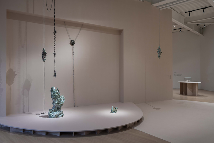 劉慧德的作品則糅合了一些想象中的景觀,現場作品《望月者》是一組如小型劇場般的裝置作品,陶瓷、鋼鏈、釉,外觀上極度抽象化,但從工藝和制造角度看又充滿著手工捏塑的痕跡。鏈條上的小手是具象的,但如同太湖石般的雕塑卻隱喻了家庭——《望月者》的靈感正是來自藝術家某一次抬頭看見滿月的經歷,她認為是已故母親的某種顯現。而《貓咪充電覺》這一有點鬼馬的作品名是陶土雕塑與聲音裝置的綜合作品,其聲音來自劉慧德探望在臨終護理機構的母親時所錄下的實地聲音,混雜了機器聲、人聲,還有來自她的家鄉澳門的田野錄音。于是,作品也不再局限于物理的實體,更是一種多重感官以及多維度時空的連接。