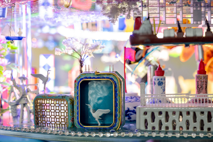 阮家儀,《登錄何處》,2023,瓷器、1910至1970年代“香港包裝”茶葉盒、1950至1980年代“香港制造”塑料制品、1980至1990年代“中國制造”塑料制品、馬達、齒輪和LED燈。圖片由藝術家提供。