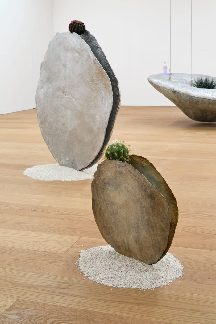 如藝術家張移北的作品一直以來都是探索自然界不同生物所演化的防御機制的延展性議題,越是柔軟的生物其軀殼越是堅硬,這種自然界的堅硬與柔軟的碰撞令她著迷。作品《鋼盔》中,滿身是刺的仙人掌球并沒有埋在沙子里,而是被放置于金屬制作的貝殼內,硬碰硬的張力將“防御”這一詞上升到一種暴力沖突的隱喻范疇。同樣的辯證性沖突也出現在陳安琦的《娩》,用高跟鞋組成盆骨這一女性生育器官的形象,高跟鞋是讓女性更為自信的時尚單品,但長期穿高跟鞋會給身體帶來各種疼痛,無益于一種社會規訓對女性的隱形偏見。