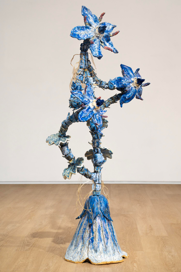 而關于身份與地緣的探討也是當代藝術的常見議題。費亦寧從女性身體出發,涉及“更年期”這一長期被誤解和嫌棄的女性人生必經階段,她以蓬勃盛開的植物造型作為陶瓷部件“嫁接”于同一莖稈,這些植物原型是琉璃萵苣、斗篷草、亞麻等,皆可用于緩解女性更年期不適癥狀。而“嫁接”后的形態顯得扭曲又奇異,就如同歷經滄桑之后回溯來時之路,這份記憶究竟是本初,還是有了取舍乃至篡改?如此,我們的語言是否也可以作為一種“容器”,容納微觀的記憶與一代人的經驗?
