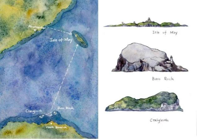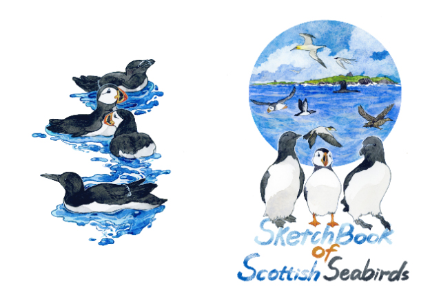 這一系列作品突破了傳統動物插畫的靜態模式,通過大量野外寫生與局部場景構建,呈現出海鳥集群、育雛、俯沖、浮游等日常的生存狀態,在保持水彩手法特有的松動與層次之余,冬六運用結構化的構圖,賦予圖像強烈的節奏感和張力。蘇格蘭的冷色調也成為她調色板上的主旋律,深藍、灰綠、赭石交織出北半球高維地區濕潤、開闊、充滿呼吸的自然氣息。與此同時,愛丁堡古老建筑的形態、石材紋理與城市中高飽和的色彩系統也在悄然塑造她的造型語言,使她的動物圖像同時具備建筑式的堅實感與文化層的隱喻。