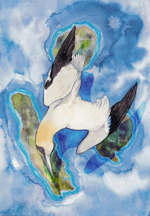 她的色彩傾向清淡克制,不追求過度渲染或戲劇性的高飽和度對比,而更注重光影、透明度和肌理變化所帶來的空間感。比如她在描繪塘鵝的經典俯沖捕獵姿勢時,會故意將背景虛化成霧狀的灰藍調,使主體顯得輕盈又具穿透力,用和清淡的水彩完全相反的濃郁蠟筆筆觸來勾勒塘鵝的主要棲息地,形成動與靜,實與虛的詩性對比。這種敏感的視覺節奏,既源自長期的野外寫生經驗,也反映出她將情緒融入自然觀測理性結果的能力。