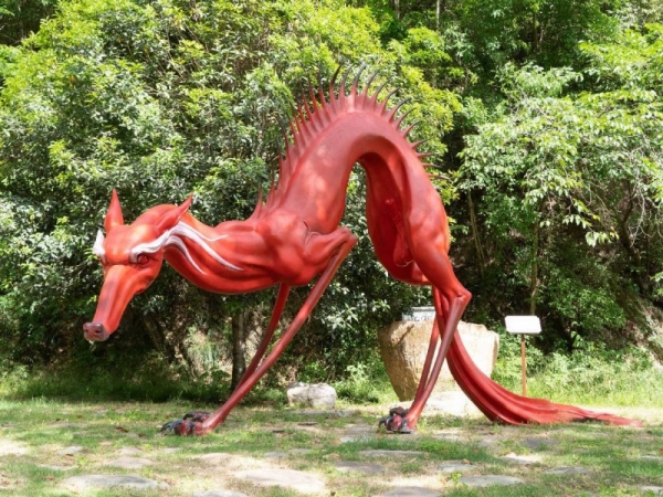此次展覽主題雕塑《九鳳》,靈感源自《山海經·大荒北經》“大荒之中,有山名曰北極天柜,海水北注焉。有神,九首人面,鳥身而青,名曰九鳳”。邱啟敬在創作中融入楚文化圖騰元素,將九鳳的“祥瑞之兆”與??迪灻饭鹊纳鷳B意境結合,雕琢出兼具古典神韻與現代張力的藝術地標。