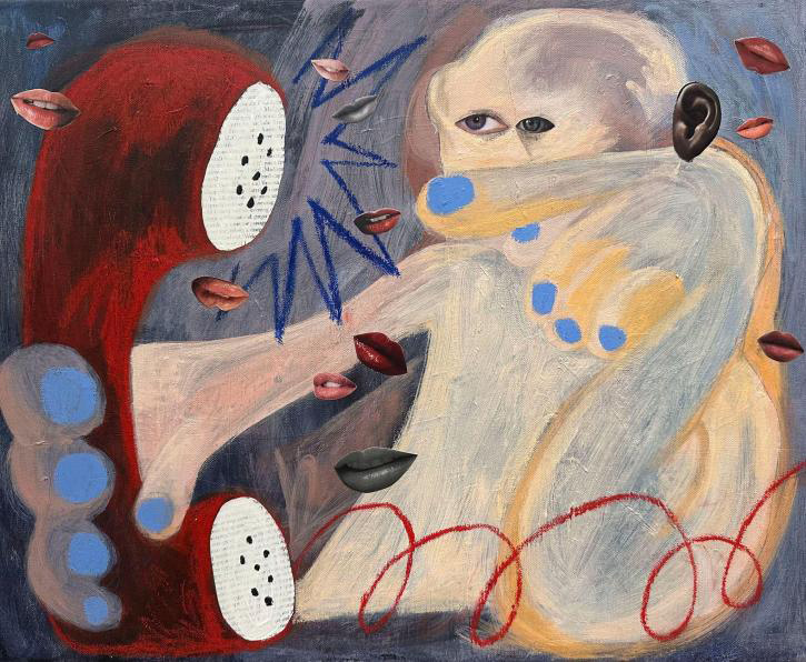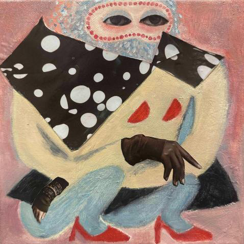 田禧在材料運用上展現出大膽的實驗精神。她打破傳統繪畫的媒介界限,通過油畫與丙烯的層疊、固體油彩與拼貼元素的碰撞,構建出獨特的視覺語言。在部分作品中,厚重的油彩肌理與亞麻布基底形成強烈對比,而雜志剪貼的幾何碎片則通過丙烯薄涂巧妙融入畫面,創造出既分裂又融合的獨特質感。這種創作方式讓偶然性成為重要元素:隨機嵌入的印刷文字可能轉化為人物服飾的細節,意外的廣告色塊或許演變成富有隱喻的背景符號。田禧將這種創作過程形容為“與未知對話”,每一片紙屑的加入都在打破既定的構圖邏輯,推動作品從預設走向即興,最終形成材料自主表達的舞臺。