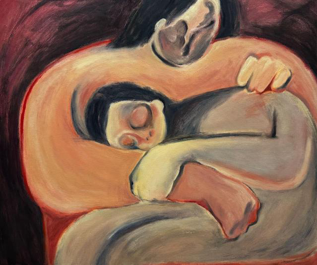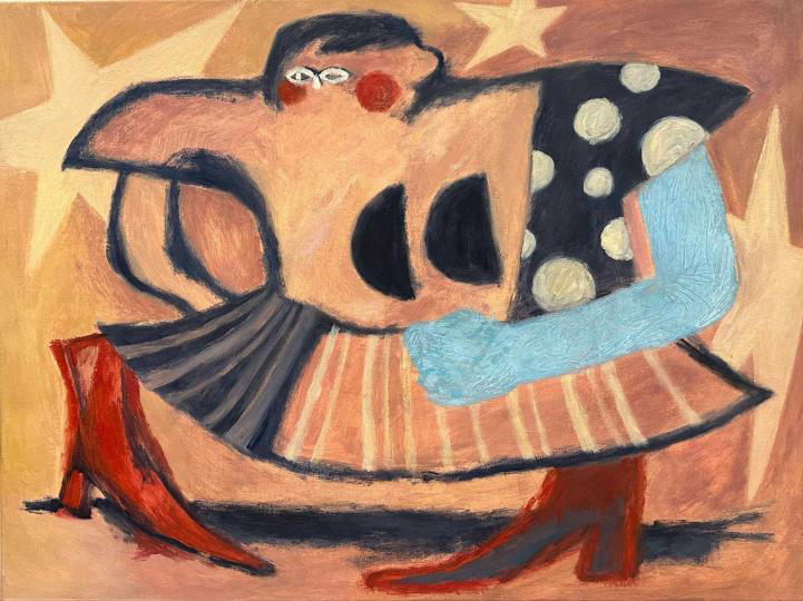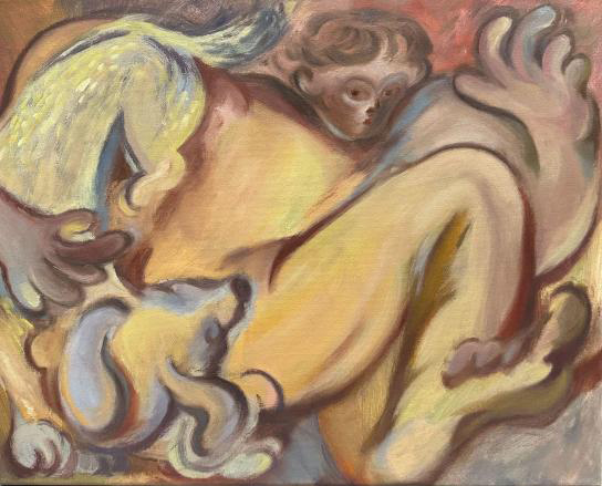 在田禧的藝術創作中,肢體語言是另一種關鍵符號。她刻意虛化人物面部,使其模糊為色塊,卻強化肢體的柔軟曲線——這種“去臉譜化”手法剝離了具體身份,讓身體成為純粹的情感載體,巧妙平衡了解構與共情,迫使觀眾調動個人經驗來解讀這些更為本質的情緒符號。受插畫學習的影響,她擅長捕捉動態中的“未完成瞬間”:那些兩人緊緊擁抱卻看不清表情的剎那、面對面呆坐的靜默、餐桌旁無聲哭泣的輪廓,或是與小狗奔跑時飛揚的動態軌跡……這些凝固的動作打破線性時間,迫使觀眾在靜止中拼湊隱含的敘事,如同從碎片還原完整故事。在作品“Run, Run, Run”中,田禧描繪了人物與小狗一起奔跑的畫面,體現人與其親密伙伴之間短暫而快樂的純粹聯系。旋轉的筆觸和柔和、發光的調色板為場景注入了溫暖和動能,喚起了一種自由、嬉戲和情感的感覺,溫暖的黃色和柔和的藍色增強了俏皮,夢幻般的品質,喚起了與心愛的同伴一起跑步的簡單,無拘無束的快樂。