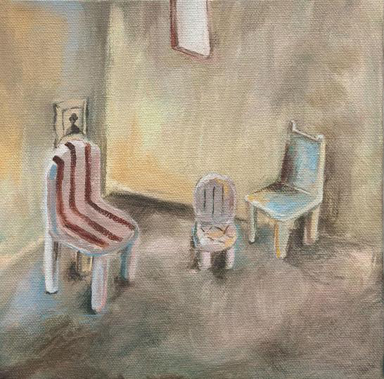 在田禧的作品中,“椅子”超越了日常物件,成為一種情感符號。它們或孤立于空曠房間,或擁擠在角落,線條時而緊繃,時而松弛,仿佛承載著無形的重量。藝術家通過油彩的厚重堆疊塑造出雕塑般的實體感,而丙烯的透明薄涂又賦予其流動的光影——這種材料對比暗示了椅子的雙重性:既是物理存在,也是情感容器。在《未命名的房間》Untitle Room中,三把椅子以微妙的角度聚攏,低飽和的色調營造出靜謐的氛圍。盡管無人落座,但凹陷的座面和傾斜的陰影暗示著缺席者的存在,仿佛時間在此凝固。這種“空椅”的意象,既映射人際關系的疏離與糾纏,也揭示情感的流動與不確定性。