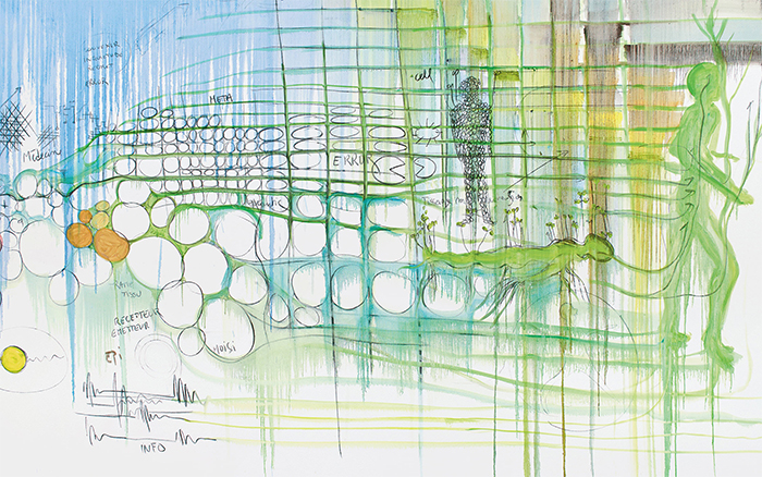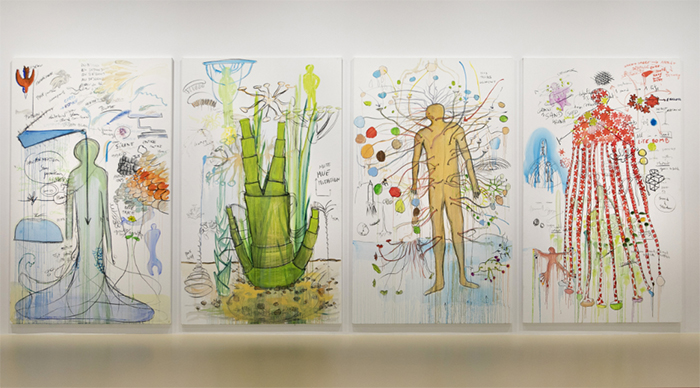 如此龐大的思維系統,伊貝爾是邊學邊做,以一種累積的方式層層疊加,逐漸生成一幅幅巨大的作品,觀眾在這些意識流般的作品面前,可以目光游移,從左到右、從右到左、從上到下、從對角線隨意地解讀它們。