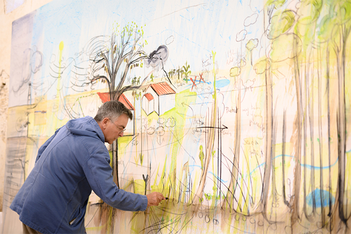 如今這片森林充溢著鳥鳴、花香和斑駁的樹影,伊貝爾離開巴黎的工作室就會經常來到這片森林里繪畫、雕刻、修剪,穿著橡膠靴和羽絨服不知疲倦地勘察他的植物領地,他向參觀的客人介紹:“如今這片森林有我小時候種下的紅杉,也有白蠟樹、柳樹、松樹、金合歡樹、七葉樹、榛樹、野梨樹、櫻桃樹……甚至還有棕櫚樹。這里還有三百年樹齡的橡樹?!?/p>