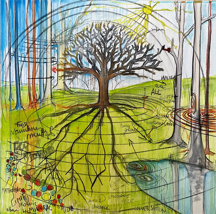 伊貝爾的畫最有意思的特點,還在于這些畫更像是一塊塊巨大的課堂白板,在畫面草木形象中,穿插著方程式、圖表、文字和神秘的符號。他不會細致描繪某種樹的特征,而是將其作為原型,描繪出樹的全息信息:根莖、果實、樹葉和龐大的根系,以及與之相關的土壤、腐殖質、水、云、廢棄物等等。他畫一個躺臥在地面的人體,人體與土壤、植物嵌入在一起,形成人與有機自然的融合與循環。伊貝爾的畫呈現了某種自然主題的動態系統展示和思考過程,包括樹木、果實、人體、人工島嶼、星宸,與他的疑問、恐懼、想法和解決方案自由地串聯起來,形成了一種名副其實的思維形象導鏈,呈現出混亂而復雜的精神世界。