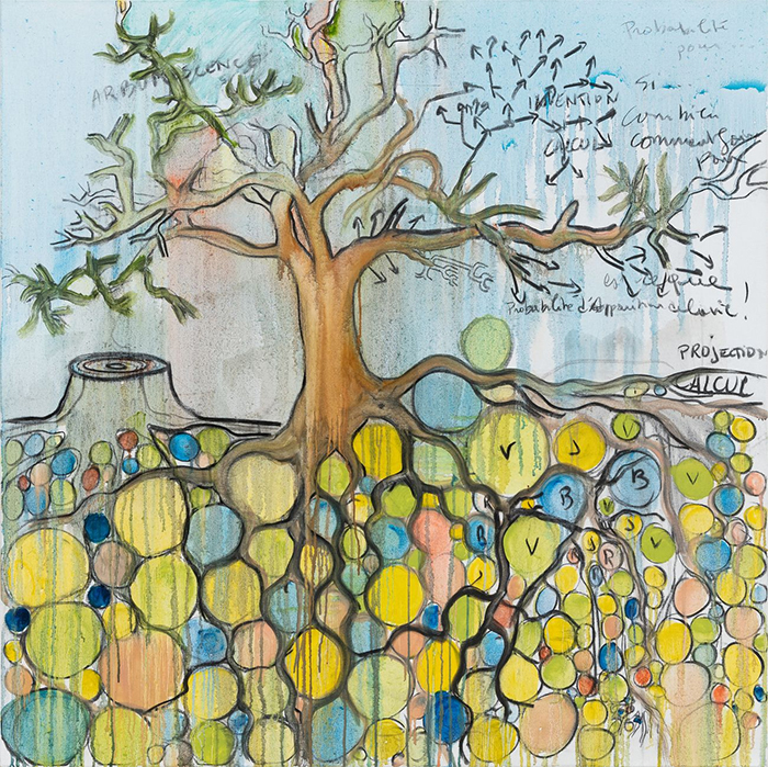 伊貝爾很喜歡畫樹,他畫樹有時像一顆種子的生長,從一個點向上生長為樹干和枝葉,向下蔓延為樹根,再畫到落葉、土壤、腐殖質...“有時他會將畫布掛在墻上,在上面寫字,等字足夠多了,再嘗試把它轉變為一幅畫。