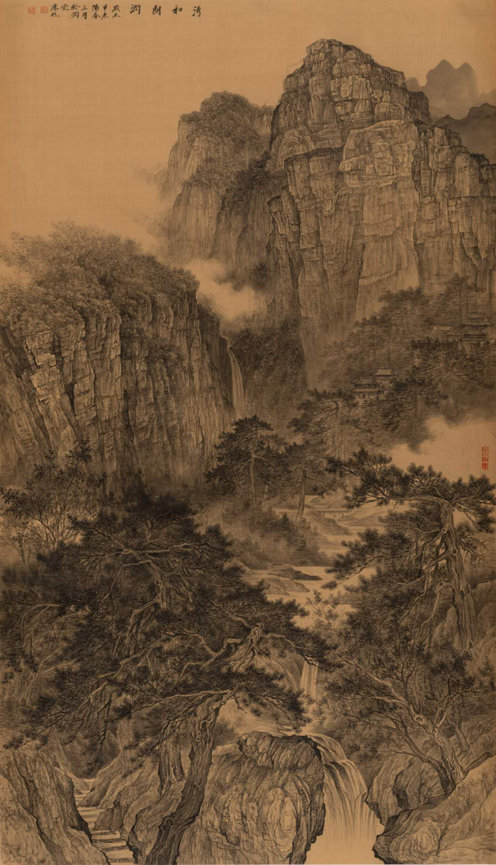 段金拾出身于書畫世家,自幼在濃厚的藝術氛圍中浸淫,家學熏陶加之個人的勤奮悟性,傳統根基比大多數同齡人更為深厚,他的山水畫創作,以雄偉峻厚、勢壯雄強的北派山水為骨法,同時汲取了南派山水溫潤華滋、云煙浩渺的造境手法,筆墨千變萬化,干裂秋風、潤含春雨,蒼莽畫境中透露出韶秀與靈光。