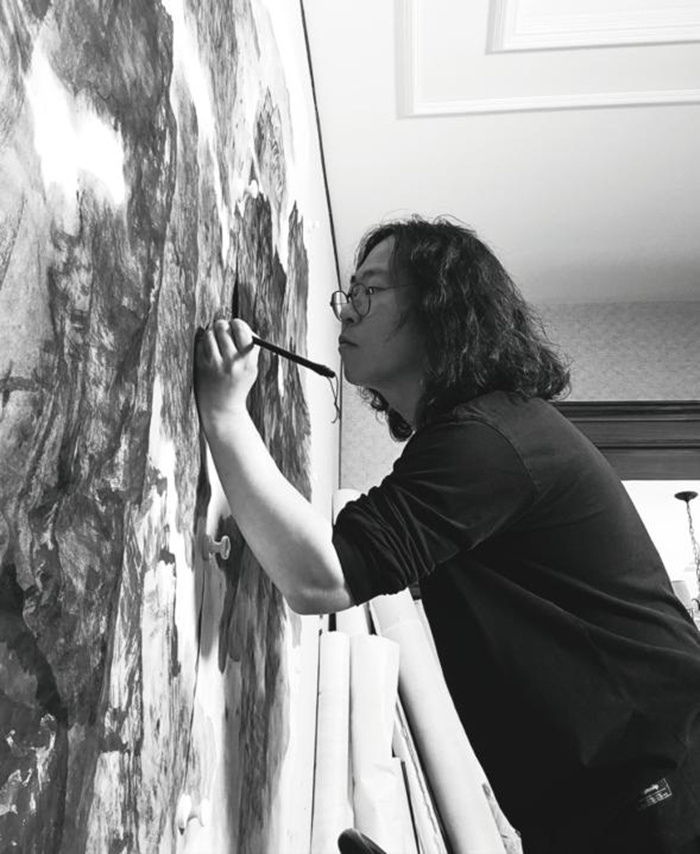 胡思然自幼師承于著名畫家段鐵先生,山水取法宋人骨法,其作品蒼茫渾厚,樸拙大器,多以北派山水全景式構圖,呈現出一種磅礴、雄強的大氣象,詮釋了當代北方山水畫派的大格局。