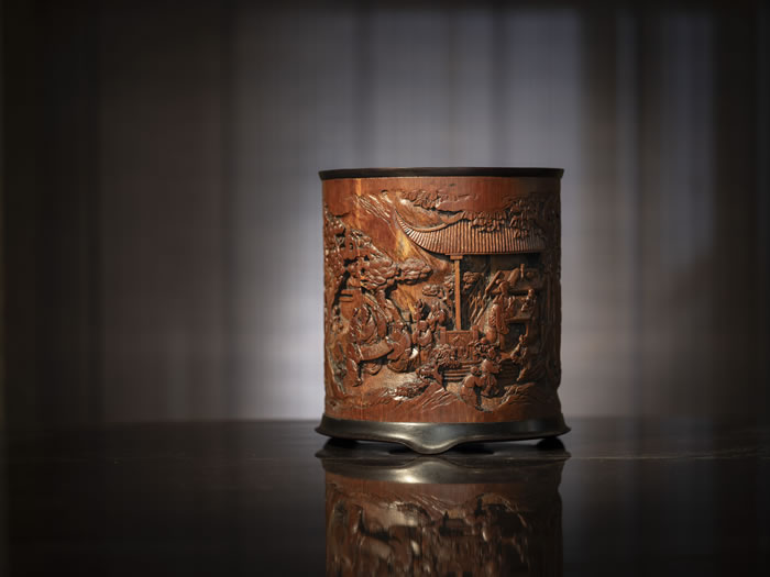 Lot 2123 清早期,顧宗玉作竹雕西園雅集圖筆筒 15.5×15×17.3cm