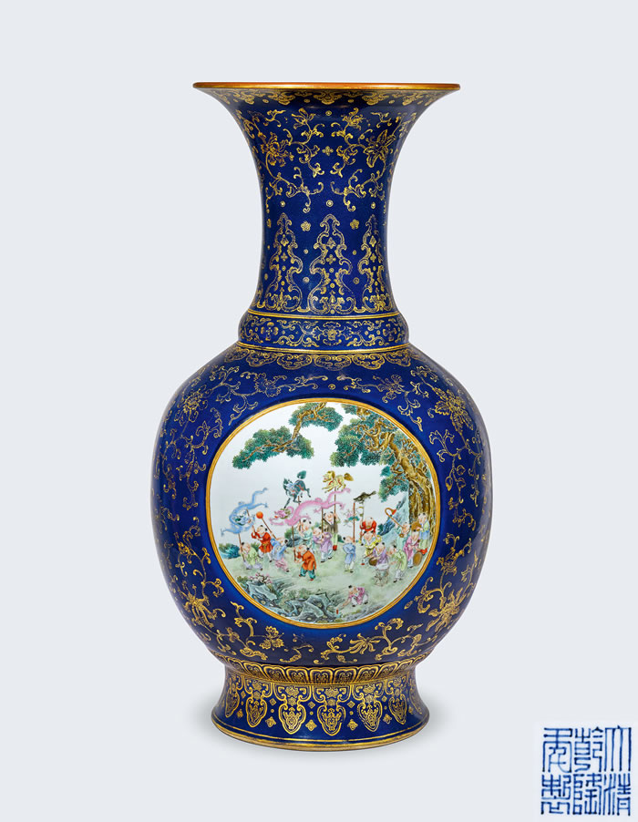 Lot 925 清乾隆,藍釉描金纏枝花卉開光洋彩百子嬰戲圖大瓶,“大清乾隆年制”六字三行篆書款,H 73.2