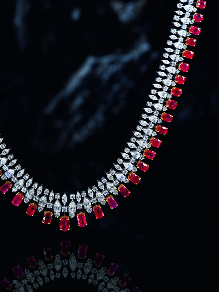 紅寶石特別奉獻有3.92克拉緬甸抹谷鴿血紅紅寶石戒指、6.18克拉及6.11克拉緬甸抹谷鴿血紅紅寶石耳環套裝;更有一條總重達41.16克拉的緬甸無燒紅寶石配鉆石項鏈;