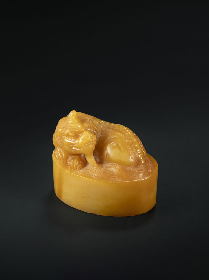 Lot 2078 清康熙,“致中和”壽山田黃石甪端鈕橢圓璽,5.8×3.8×5cm;152.5g;