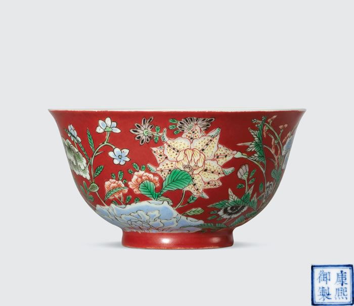 Lot 1044,清康熙,珊瑚紅地五彩加琺瑯彩九秋同慶圖小碗,“康熙御制”四字雙行楷書款,D 11