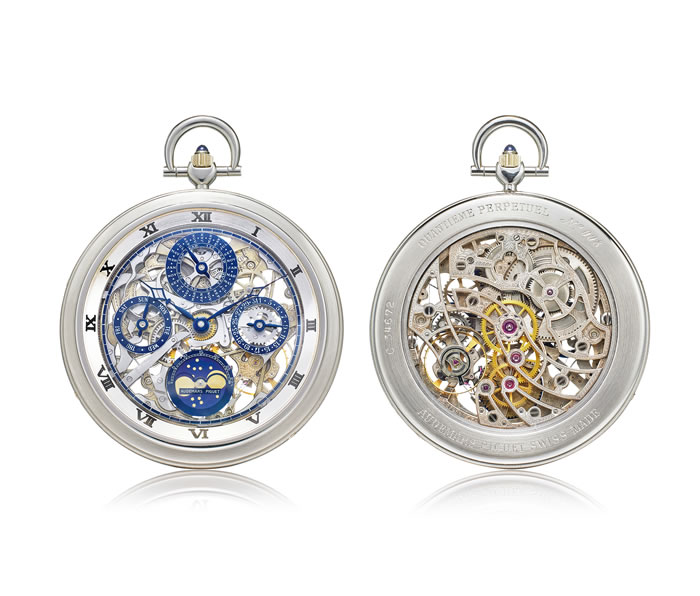 Lot 1513 愛彼,18K白金 表冠上弦鏤空懷表,萬年歷 月相 約1970年代 ,表徑:48mm