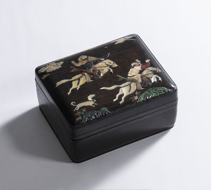 Lot 2109 明晚期,紫檀百寶嵌狩獵圖長方盒,14.4×11.7×7cm