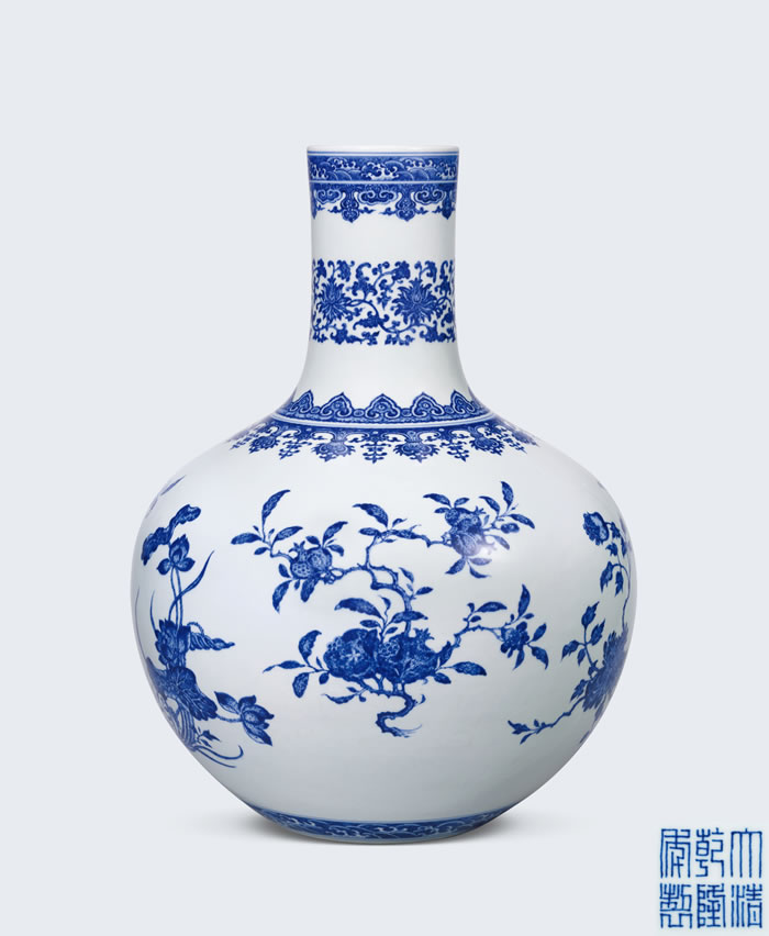 Lot 991 清乾隆,青花折枝花果紋天球瓶,“大清乾隆年制”六字三行篆書款