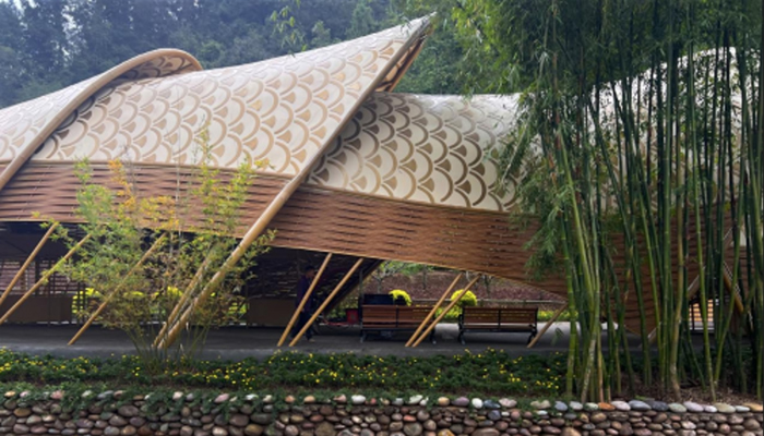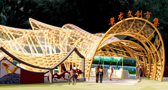 最富創意的當數“草龍市集”,這是一個超大體量的鄉村市集,一個集文創、農產品市集、特色文化景點為一體的綜合活動空間。創作靈感來源于當地國家級非物質文化遺產“沐川草龍”,以“龍身竹體”的形式呈現靈動通透的外觀,傳達了源自于草龍精、妙、奇、神的特點,打造富有藝術氣息的本地特色市集。草龍市集主體采用了不同直徑的鋼管經過雙曲拉彎、塑型等特殊工藝制作成仿真竹節,以此達成竹節的藝術化處理,同時具備防腐、承重、抗風抗震等功能。外部棚頂取自龍鱗抽象化的視覺元素,里外雙面采用貼面模具打造,以不同大小、角度和造型焊接到金屬竹體結構上。整個市集基于人體工學、材料學等交叉學科的應用性科學測試,確保安全。此外,龍頭采用亞克力立體字體,龍尾采用當地特色竹藝制作牌匾,并且采用藝術吊燈、LED燈帶等配飾營造古典,并兼顧現代科技的東方美學風格。市集總長50.515米,寬9.939米,總高8.274米,總面積達502平方米,開闊的空間尺度配合通透的結構充分展現出舞耍草龍的靈動性,也完善了鄉村市集的功能。何焰率中農農旅團隊設計建造的草龍市集因此也超越了普通鄉村市集,以龍騰竹影般的藝術氣質彰顯文化的傳承與創新。這些景觀節點宛若一顆顆璀璨的星星,不僅美化了鄉村環境,更吸引眾多游客慕名而來,激活當地經濟。
