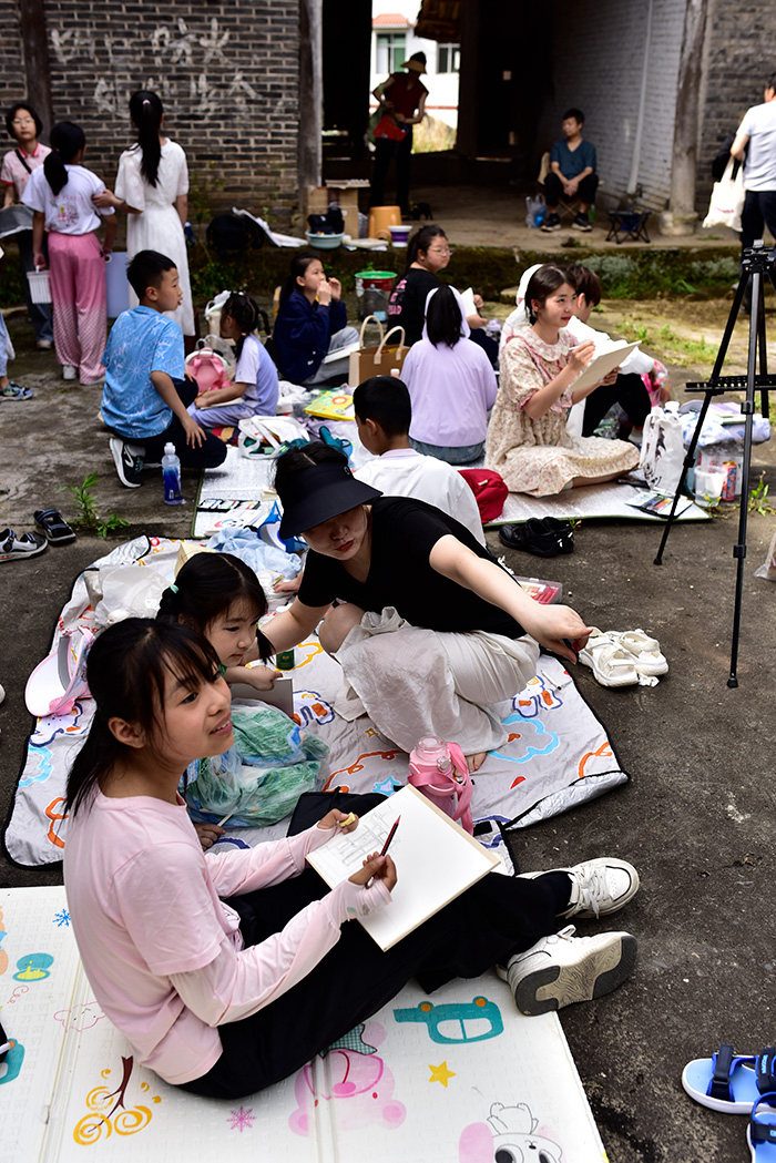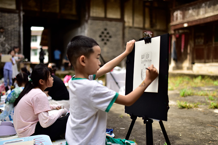 第二天,活動移師南部縣川北傳統院落——李家大院。孩子們在老師帶領下參觀古建筑格局、木雕門窗、青瓦飛檐,沉浸式感受川北民居的獨特魅力?,F場特別邀請藝術家何晉渭、西安美術學院研究生張云飛與江君泰進行戶外寫生示范。在三位藝術家的帶領下,學生們架起畫板、鋪開速寫本,以傳統院落為主題展開寫生創作。有人描繪院墻青石之厚重,有人描繪檐下光影的柔和,也有人自由發揮,創作出富有幻想色彩的“夢中庭院”。在文化與美的交融中,孩子們用畫筆表達對傳統文化的敬意與熱愛。