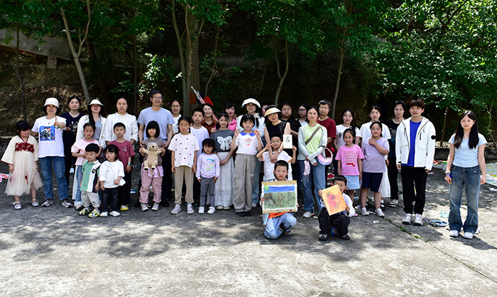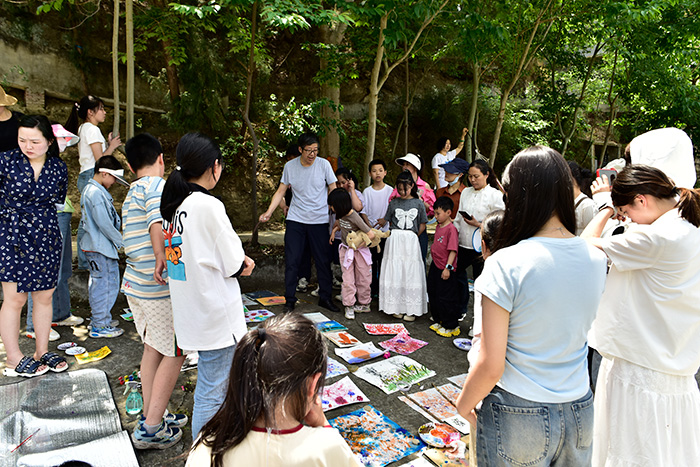 在綠意盎然的松云洞村,孩子們與父母一同開啟了“自然里的藝術家”親子創作營。大家在田野之間采集樹葉、花瓣、枝條等自然材料,在導師引導下拓印、拼貼、繪畫,自由揮灑春日色彩。大畫布上手掌成印、滾筒作畫,一幅幅天馬行空的作品躍然布面。除了自由繪畫,活動還設置了“自然雕塑挑戰賽”、“速寫本藝術之旅”等項目,孩子們一邊在村莊中漫步,一邊用筆記錄自己發現的小雞、老屋、樹影與田野。這不僅是一場藝術活動,更是一場親子間共同感知自然、表達心靈的旅程。