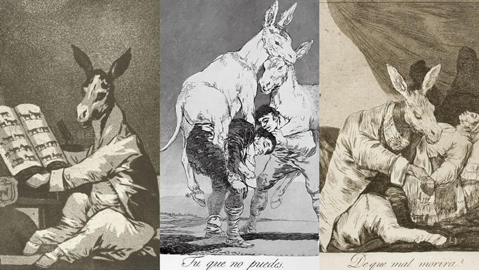 “驢”的意象成為貫穿龔若愚創作的核心隱喻。這一形象其實在藝術史中并不少見,給人印象最深的是弗朗西斯科·戈雅(Francisco Goya)的《狂想曲》(Los Caprichos,亦譯為《奇想集》),他通過寓言中動物和夸張的角色來影射所謂文明社會中的弊病和荒謬,而戈雅筆下的驢常指涉那些缺乏獨立思考、盲目追隨權威或傳統的人。
