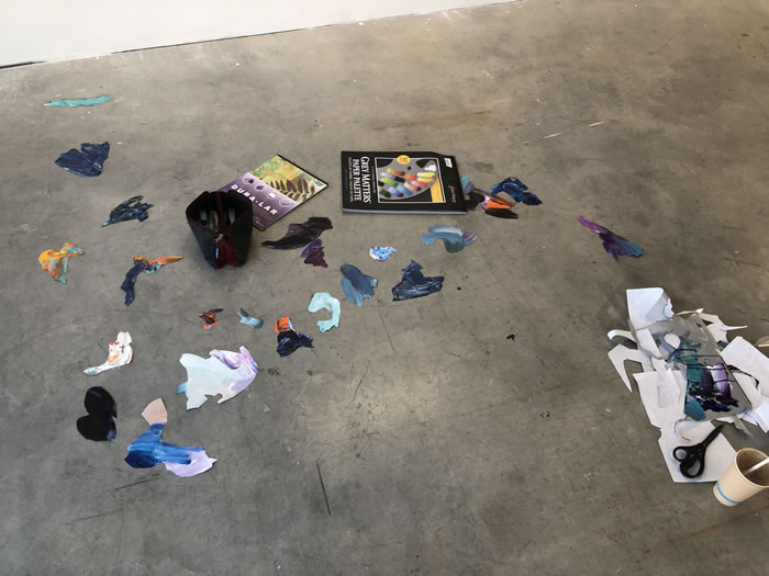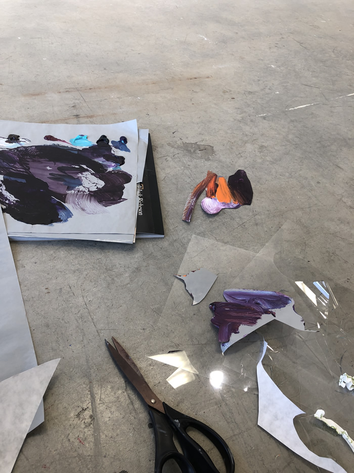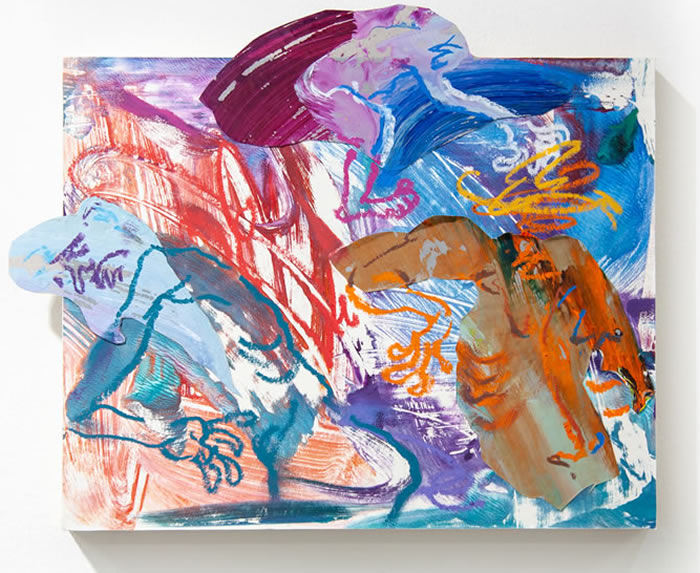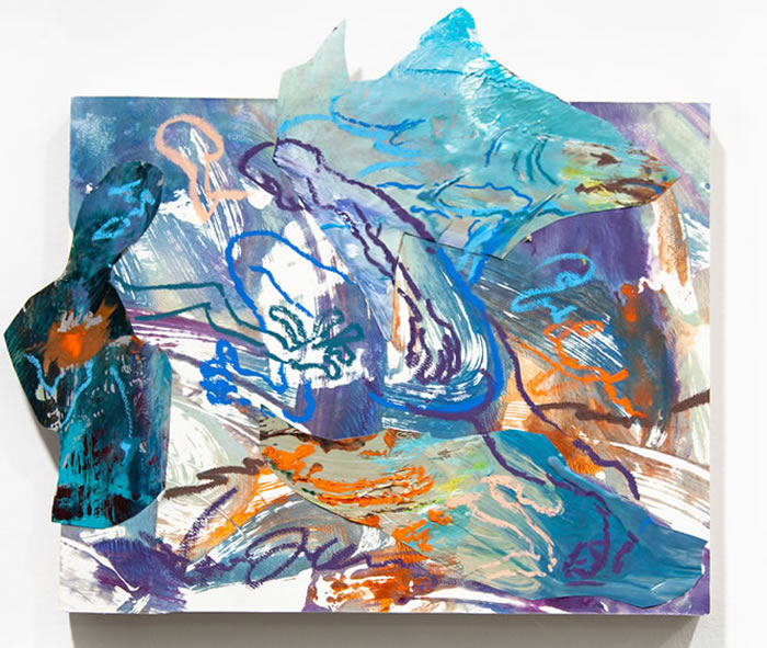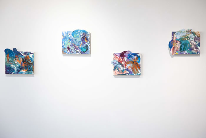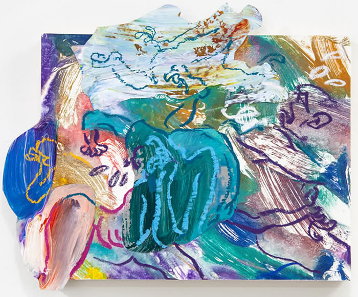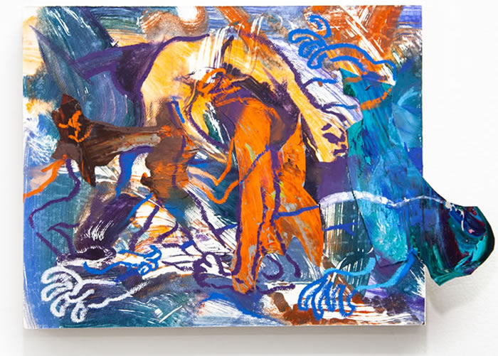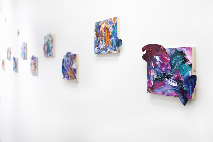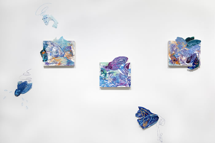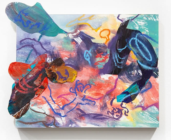 除此之外,他還通過拼貼元素進一步打破作品的邊界:調色盤殘骸被剪裁為不規則形狀,轉印復刻的亞克力版在肢解后被嵌入畫面……龔若愚形容自己的創作為一種冥想與內觀:“腦海中的場景就如同拼貼一樣從來不是規則的,它的形狀正契合了我的情緒邊界。”