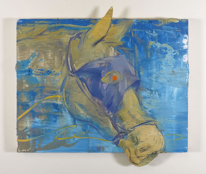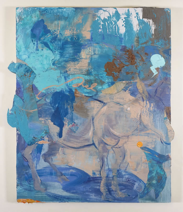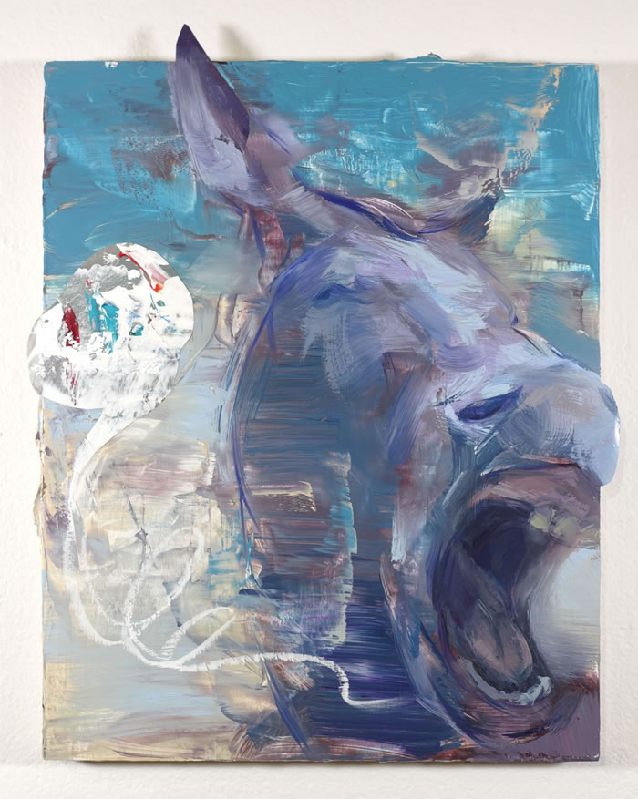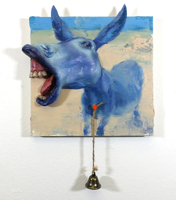 第一次看到龔若愚的畫,就被他畫面上迸發出的情緒牢牢抓住。那是他2024年底的一系列作品,藍驢的形象以不同形態出現在畫面中,有的脖子上墜著鈴鐺、有的雙眼蒙上眼罩,作品特意突破畫框邊界進行了雕塑和綜合材料的拓展,更加劇了整體的視覺沖擊感,似乎隔著屏幕都能聽見驢子的嘶吼聲。