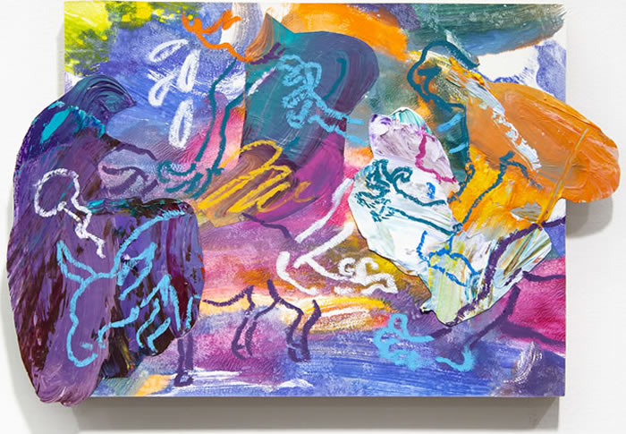 無疑,若愚筆下的驢是具有象征意味的。而他近期在紐約A Space Gallery舉辦的最新個展“笑點之下”(Beneath the Punchline)則讓人看到在不到一年的時間里這位青年藝術家的探索和蛻變。在具象與抽象,視覺與語言的轉譯之中,他的作品更加成熟而松弛,更重要的是,隨著形象的隱匿,潛意識浮現并得以于伸張真實的自我,讓我們聆聽到“笑點之下”,一位游走于中美藝術教育背景下的青年藝術家的困境、掙扎、黑色幽默中的自嘲,與篤信當下的執著。
