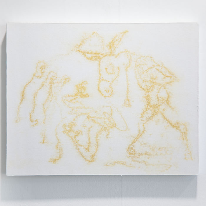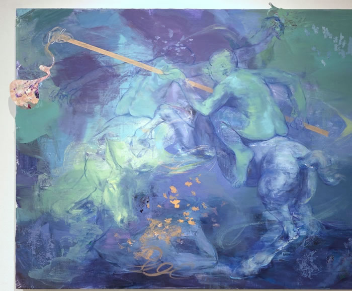 在早期作品中,我們看到“畫什么”對龔若愚來說似乎還很重要,十年專業的傳統訓練讓他能夠通過繪畫、拼貼甚至雕塑等多元方式滿足和豐富其作品期望的敘事性。然而個展“笑點之下”卻給了我們不同的面貌,驢的形象漸漸從畫中隱退,抽離成糾纏的線條,圖像看似隱晦,但繪畫痕跡躍然成為了語言的可視覺化呈現,寓意在其間若隱若現。如果說敘事性需要具象來承載內容,那脫離敘事的桎梏,感受力表達便如同一匹脫韁的野馬。同樣,從受眾角度,過分寫實往往容易剝奪觀眾的感受空間,而龔若愚的新作品就如同抽絲剝繭,留給觀者更多想象余地,參與到創作的延續和發展中來。