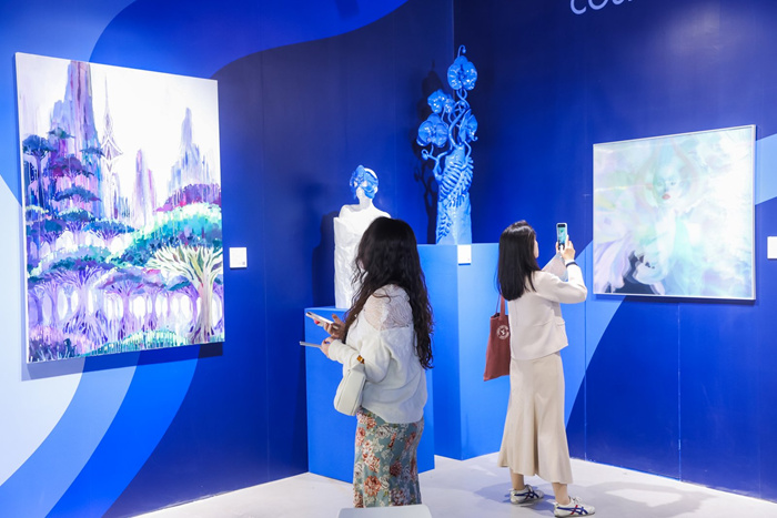 在《蛹變》中,費德洛娃將平面繪畫、雕塑、立體光柵印刷、AR影像等多元媒介相互交織。觀眾不僅可以欣賞作品本身,還可以通過手機掃描畫面,激活AR場景,從而延續畫面中的故事。多媒體視覺敘事隨著觀眾的移動變化而變化,打破了觀看的單一性,也拓展了藝術作品的時間與空間維度,為觀眾帶來前所未有的沉浸體驗。展位現場,許多觀眾駐足欣賞、拍照互動,紛紛表示“像進入了一個柔軟的數字世界”,“作品和身體在一起呼吸”。